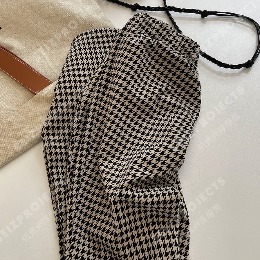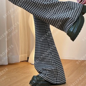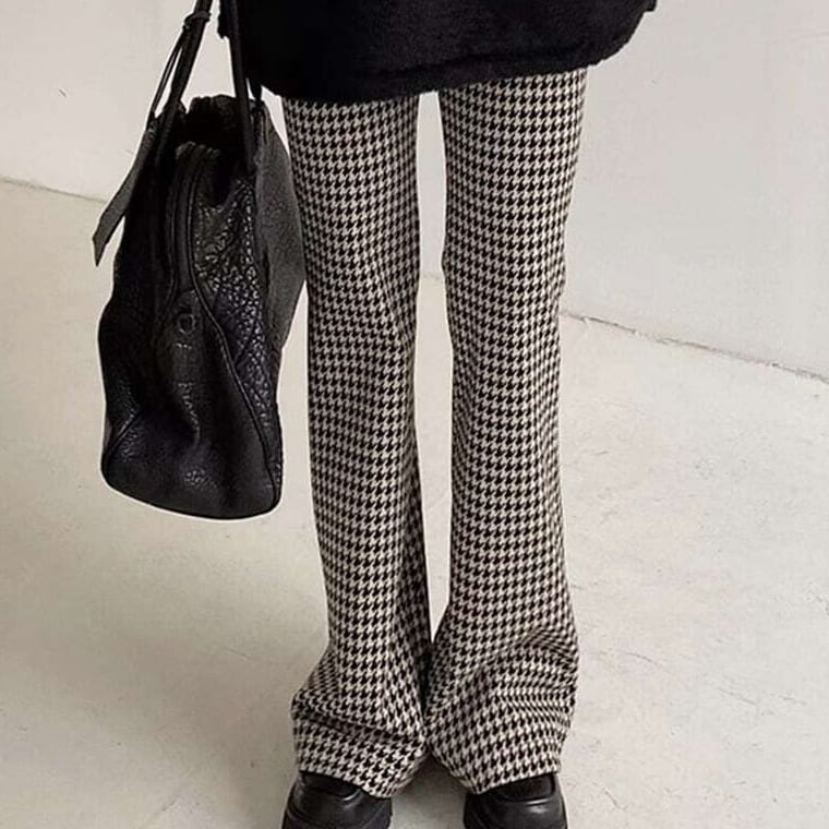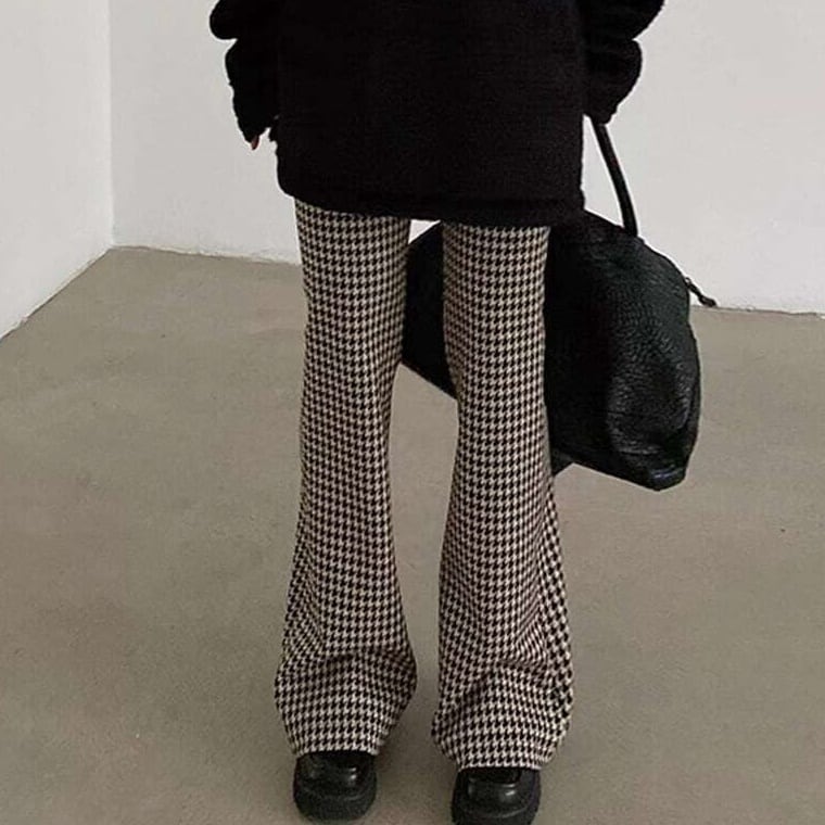 オシャレな千鳥格子柄が目を引くフレアパンツ。