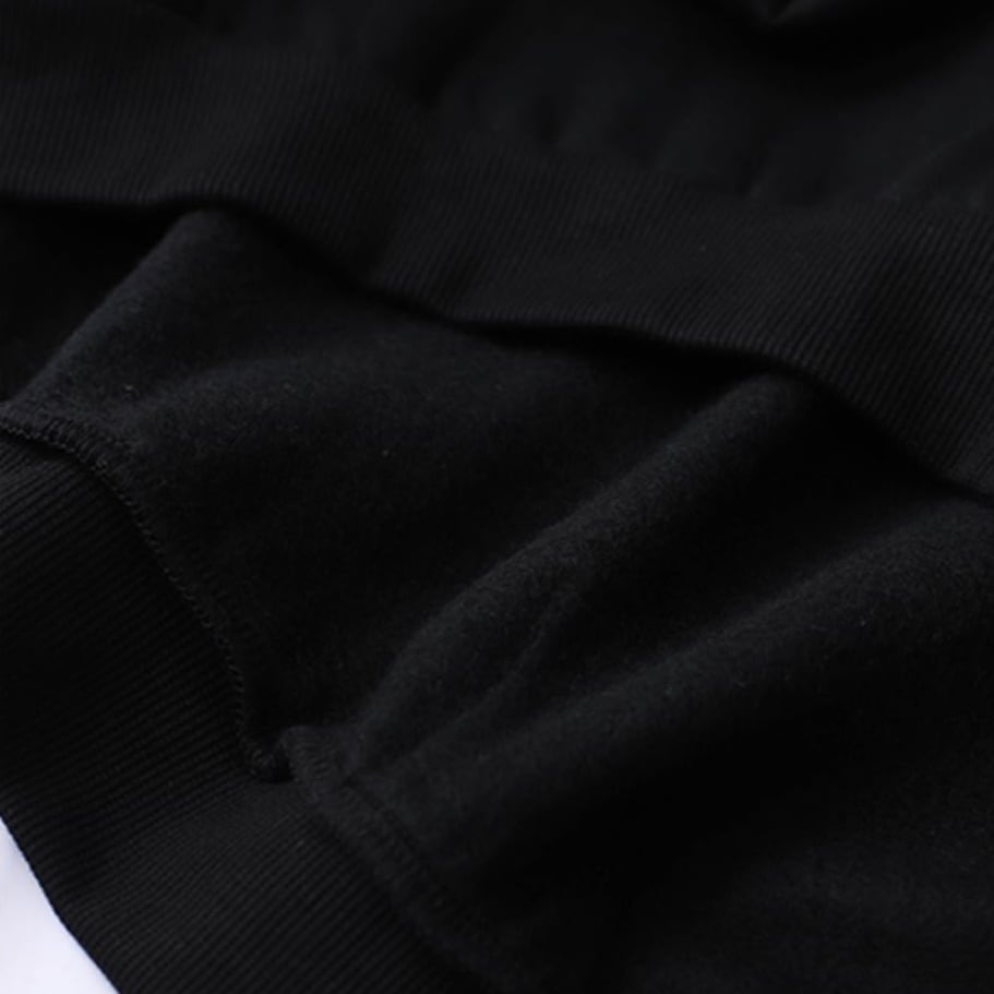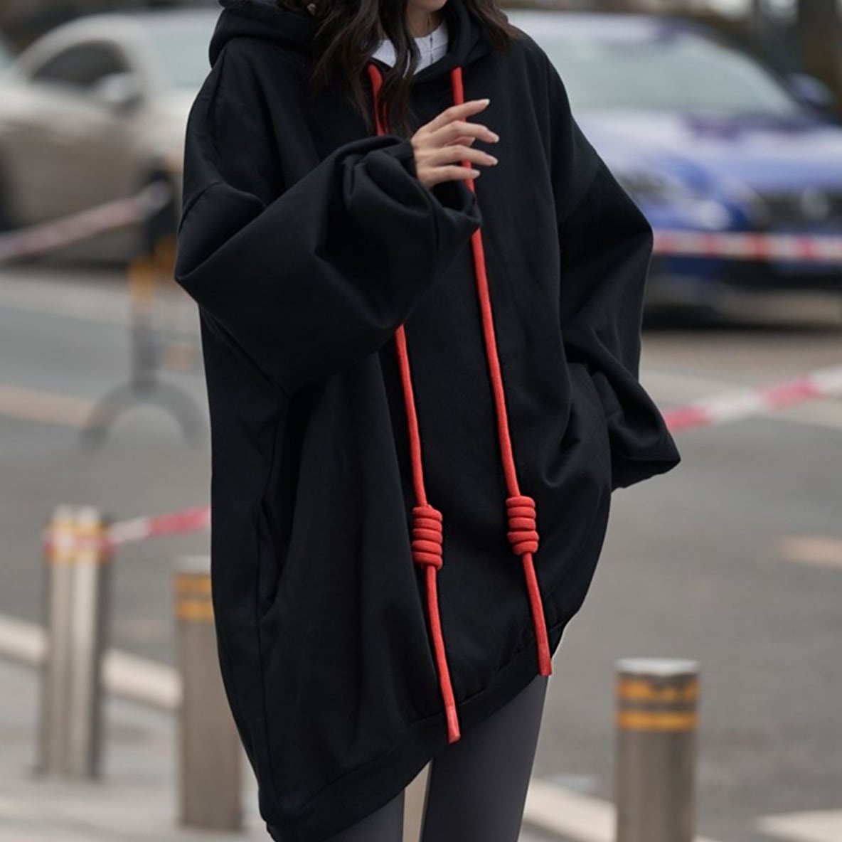 ブラックのスウェットにオレンジの紐使いが印象的で