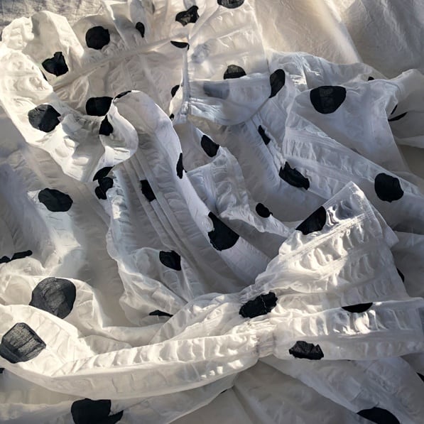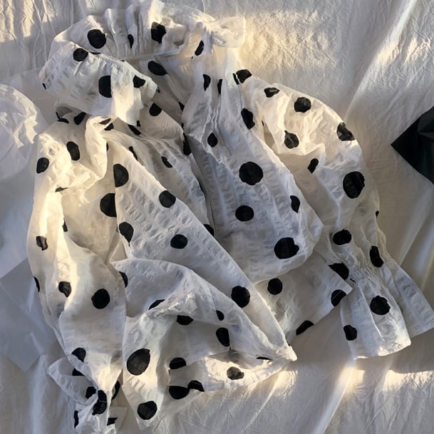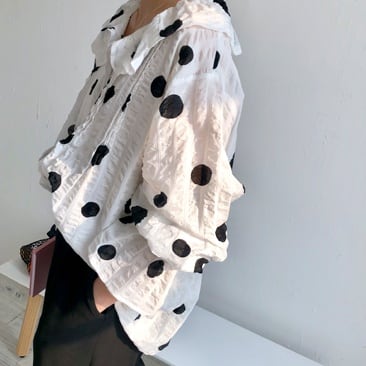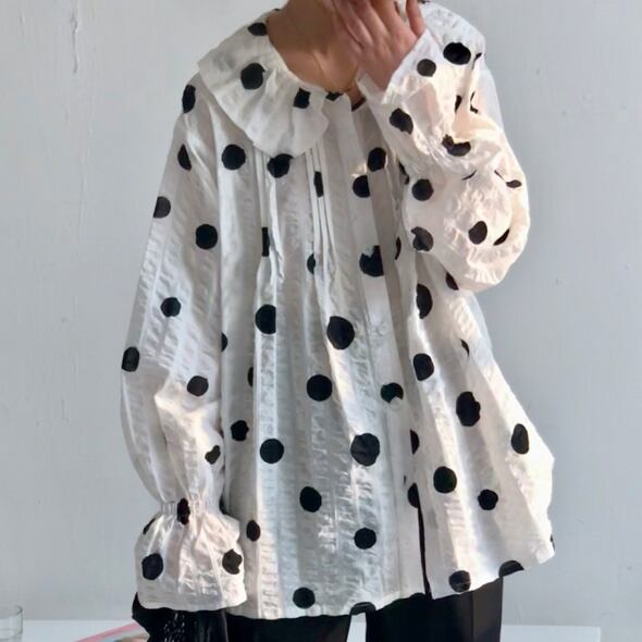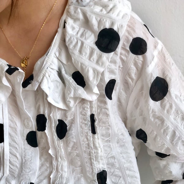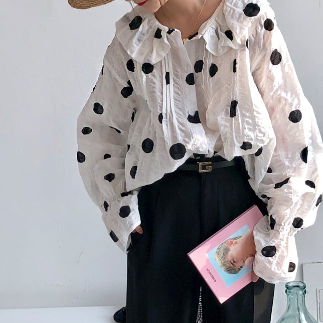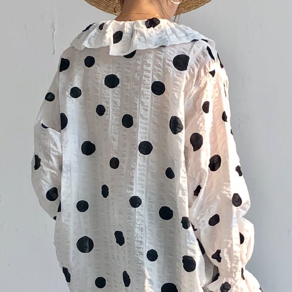 愛らしいフリルカラーとドット柄が魅力のシャツ。