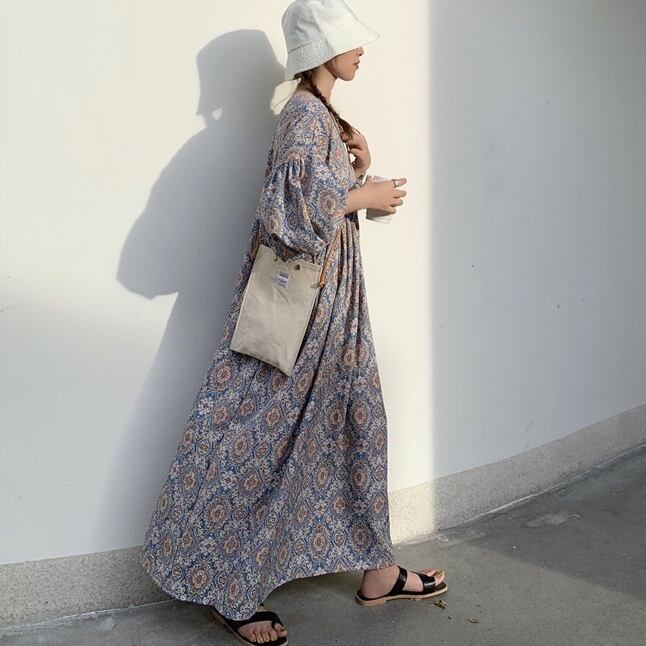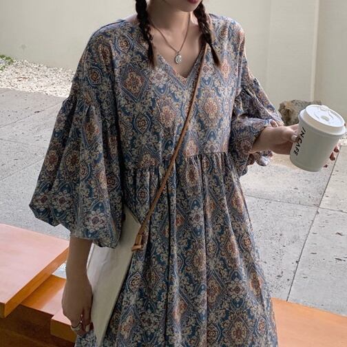 レトロな柄が雰囲気を漂わせてくれる、落肩袖の大きなパフスリーブの