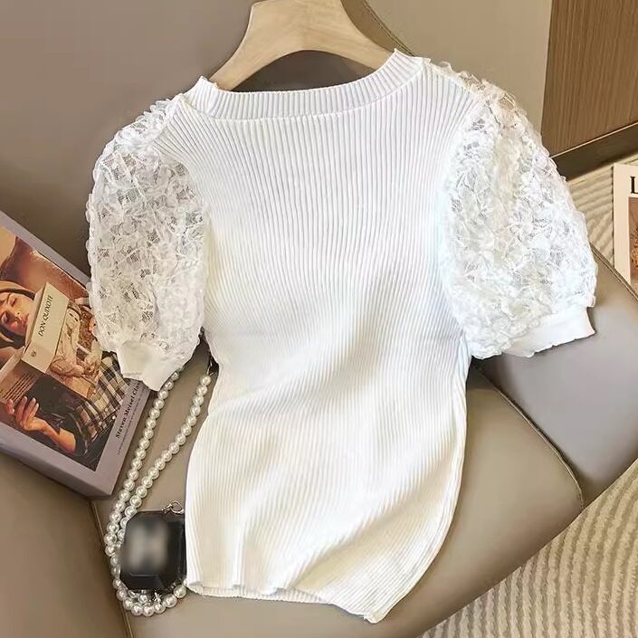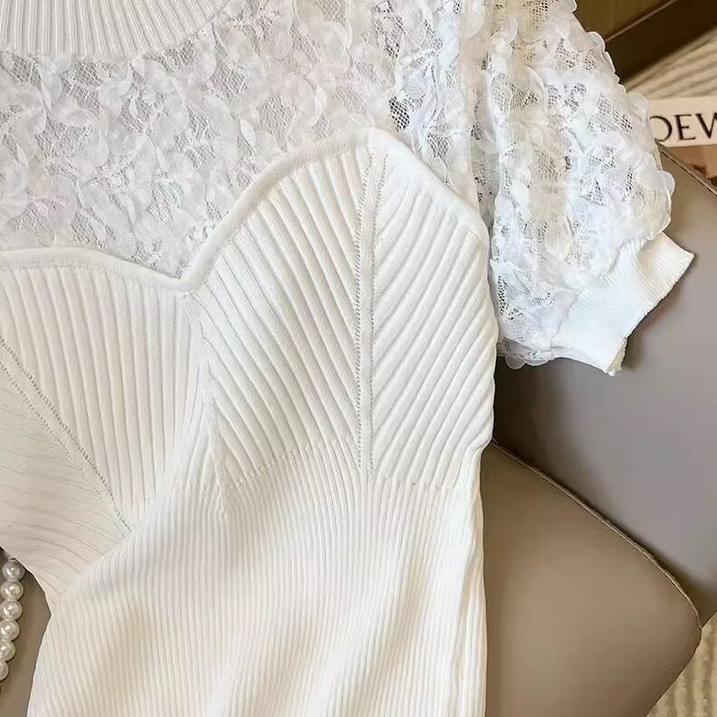 トップの花柄レース使いが上品で可憐な印象を与え、透け感がセンシュアルな雰囲気をかもし出します。編み地の繊細さにも注目していただきたい。