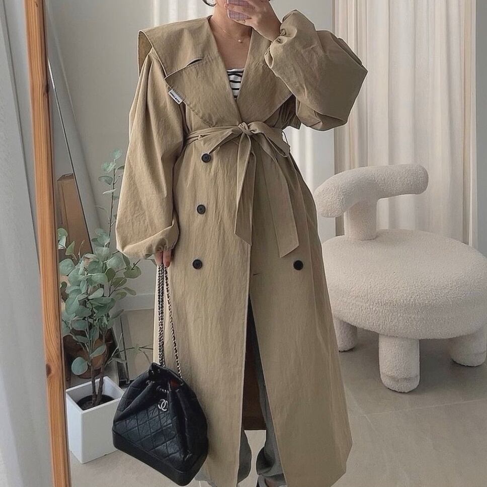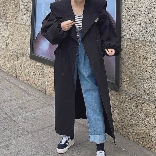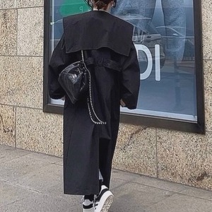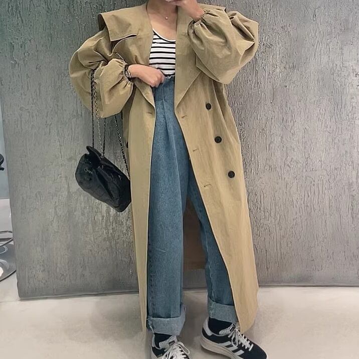 大きなセーラーカラーと、ふんわりとしたパフスリーブが魅力のウィンドブレーカーロングコート。スタイリッシュでありながらも女性らしさを引き立てるデザインです。