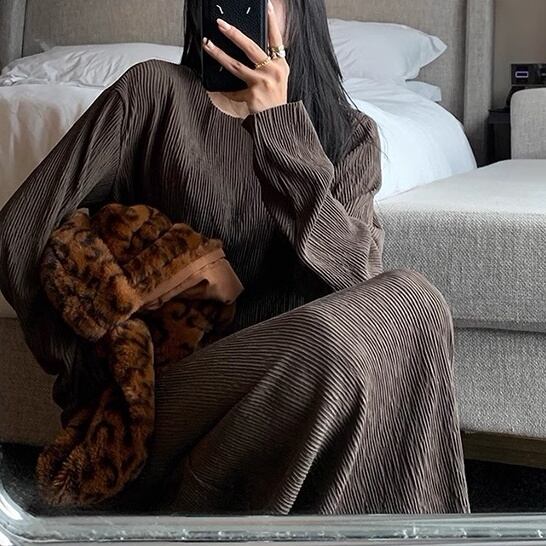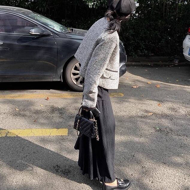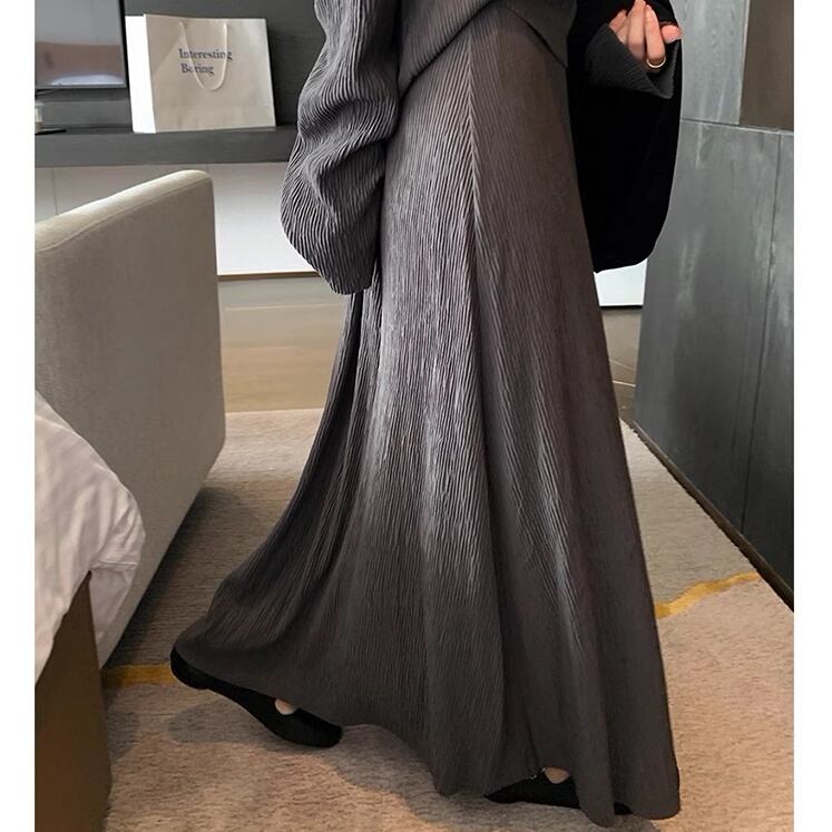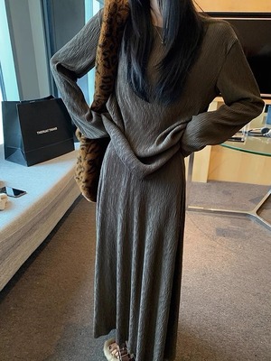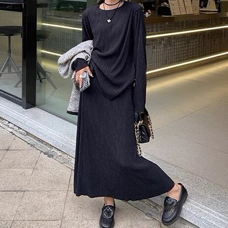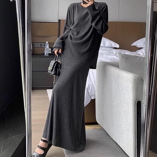 ゆったりとしたシルエットが魅力のトップスとスカートのセットアイテム。