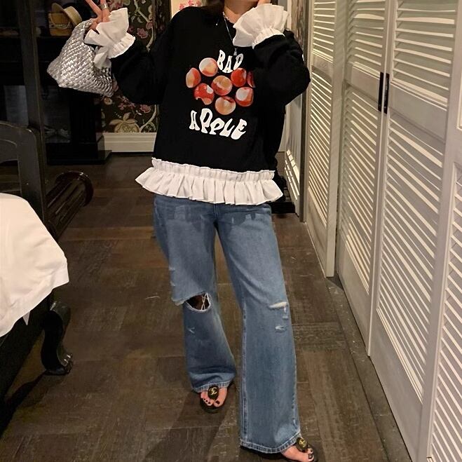 裾と袖口のフリルがポイントで、可愛らしさをプラスしてくれます。